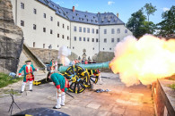 Die Kurfürstlich-Sächsischen Kanoniere Augusts des Starken vom Schützenverein Friedersdorf feuern mit der museumseigenen Kanone „Starke Auguste“. Achtung, es wird laut! Das historische Vorderlader-Geschütz ist 300 Jahre alt und befindet sich auf der Johann-Georgen-Bastion an der Westseite der Festung Königstein. Es handelt sich um eine 24-pfündige Halbe Kartaune mit einem Rohr aus Kanonenbronze. - Rohr-Länge: 328 cm - Rohr-Gewicht: 3215 kg - Kaliber (innerer Rohrdurchmesser): 150 mm Damit konnten Kugeln mit einem Gewicht von bis zu 24 Pfund verschossen werden. Dieses Rohr gehörte zu einer Serie von ehemals 21 Stücken, die 1712 bis 1717 von Michael Wittwerck in Danzig im Auftrag Augusts des Starken gegossen wurden. Es ist auf einer sächsischen Festungslafette gelagert, die nach originalem historischem Vorbild nachgebaut wurde. Auch der Anstrich entspricht den historischen Vorlagen: die Eisenteile sind mit gelber Eisenmennige und die Holzteile mit schwarzer Teerfarbe angestrichen. Am 26. April 2023 ist das historische Kanonenrohr vom Beschussamt Suhl geprüft (beschossen) worden. Seitdem verfügt das Museum Festung Königstein über eine eigene böllerschussfähige Kanone und kann den Besuchern historische Waffentechnik live vorführen.