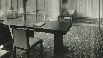 (Bild: Haus Lemke, Arbeitszimmer mit Innenausstattung. Entwurf Mies van der Rohe und Lilly Reich (?), 1934/35, Blick vom Schlafzimmer © Staatliche Museen zu Berlin, Kunstgewerbemuseum / Max Krajewsky)